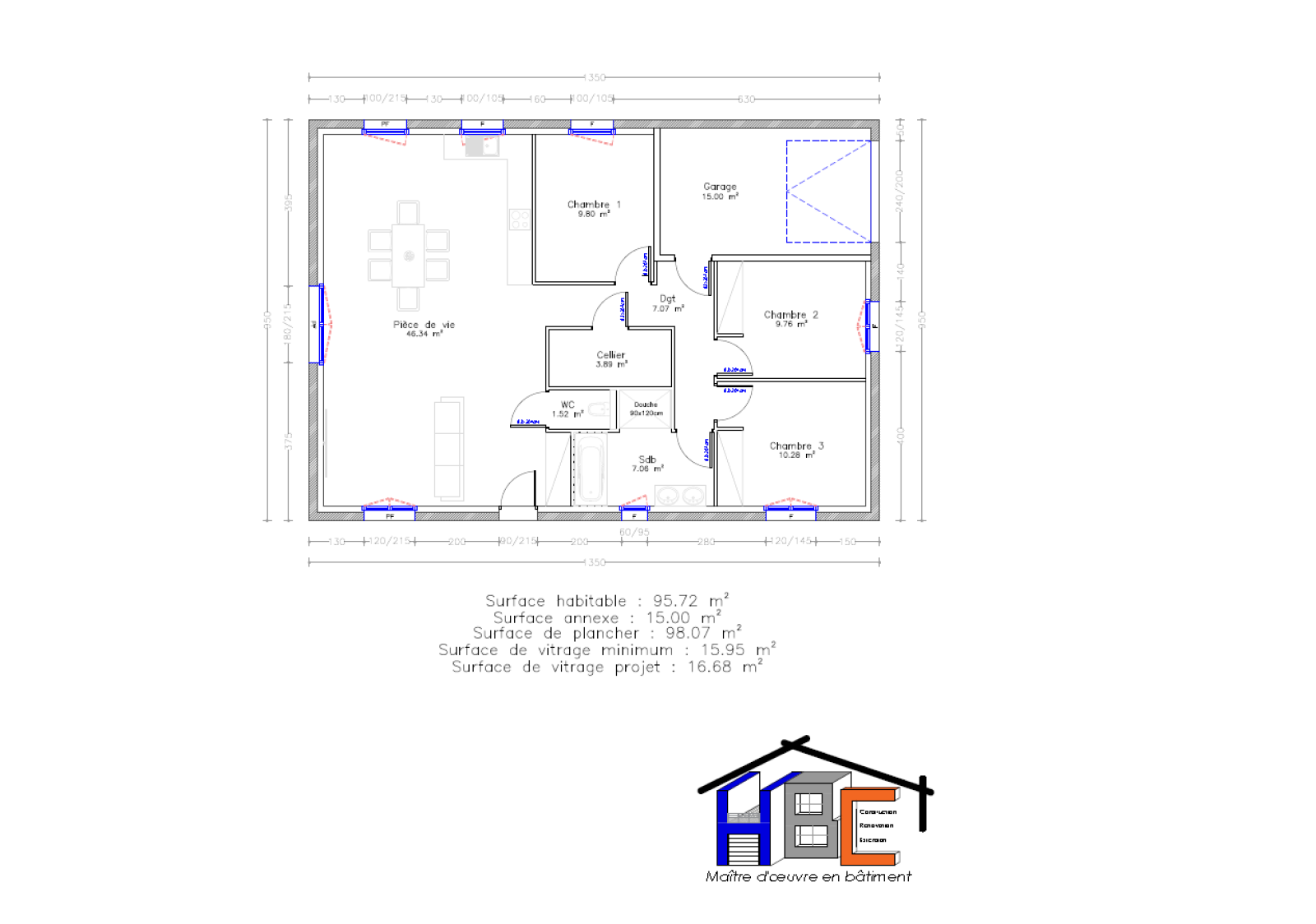 Notre client nous a consulté pour la construction de sa maison à Pont-à-Mousson. Il est déjà propriétaire de son terrain familial et souhaite y construire sa future maison. Etant seul, notre client nous a informé de son budget restreint à impérativement respecter. Nous avons donc opté pour une maison de plain-pied, solution moins coûteuse qu'une maison à étage.
